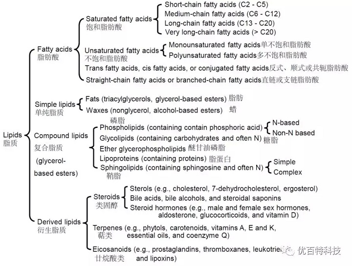 首先要從脂質說起。脂質又稱為脂類,是一類不溶于水(一些小分子物質除外)而溶于有機溶劑(如氯仿和乙醇)的碳氫化合物。根據Dr. Guoyao Wu 編著的《Principles of Animal Nutrition》中定義[1],脂質可以分為脂肪酸、單純脂質、復合脂質和衍生脂質(見下圖)。