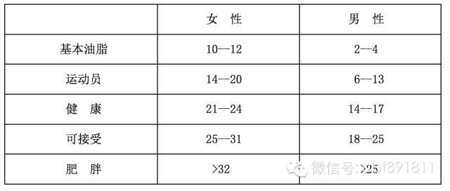 表:女/男性的身體油脂的體重百分比